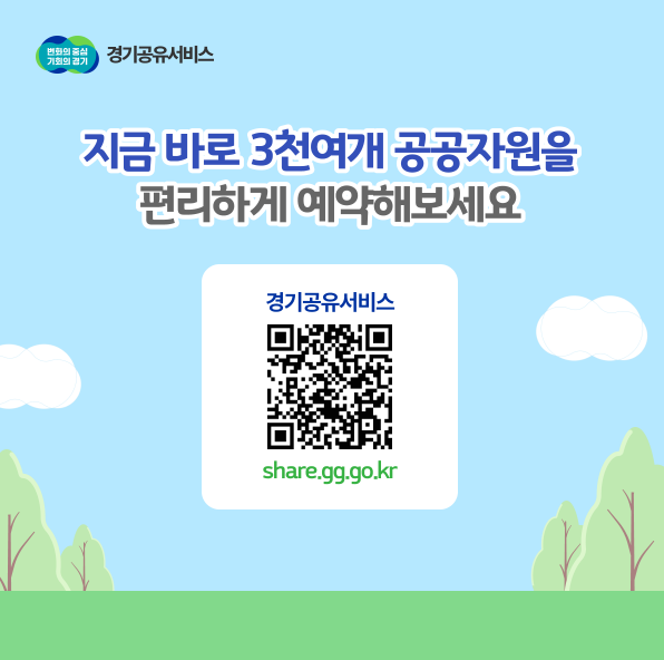 경기공유서비스(share.gg.go.kr)란 경기도민이면 누구나, 온라인으로 공공대관을 예약할수있는 경기도 통합예약 서비스입니다.